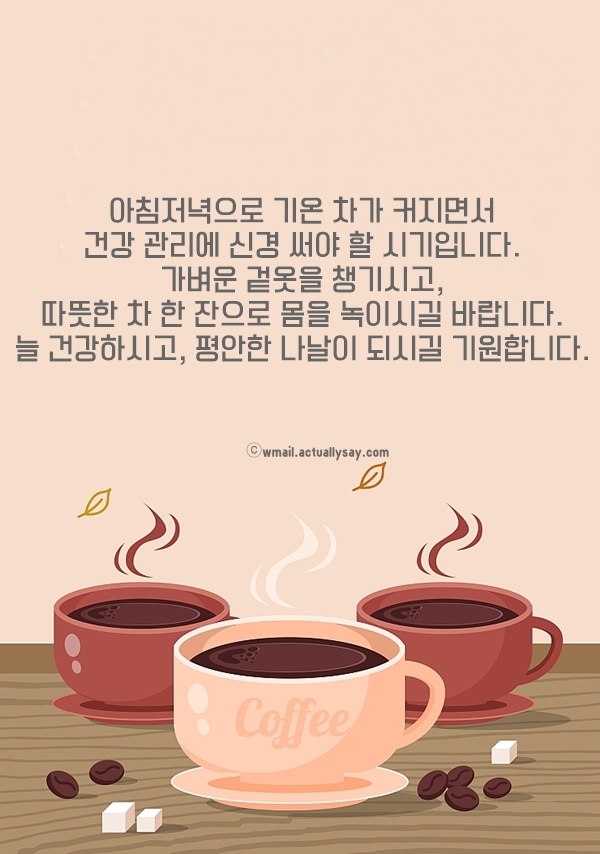 아침저녁으로 기온 차가 커지면서 건강 관리에 신경 써야 할 시기입니다. 가벼운 겉옷을 챙기시고, 따뜻한 차 한 잔으로 몸을 녹이시길 바랍니다. 늘 건강하시고, 평안한 나날이 되시길 기원합니다.