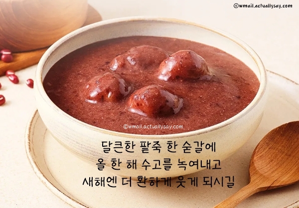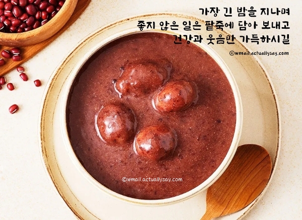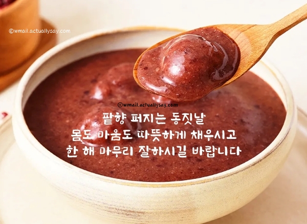 오늘은 작은 설날로 불리는 동지입니다. 붉은 팥죽 한 그릇으로 한 해의 나쁜 기운을 씻어내고 다가오는 새해의 행복을 준비하세요. 따뜻한 하루 보내세요.